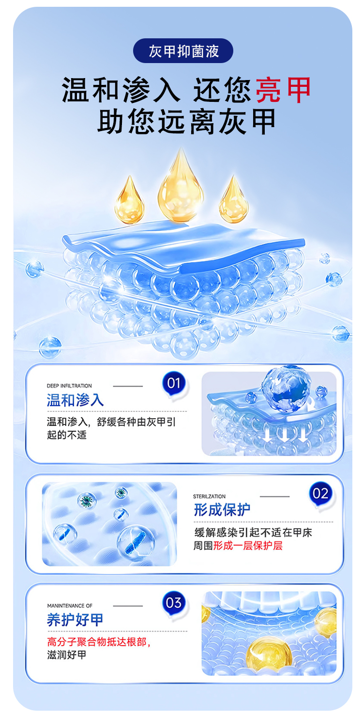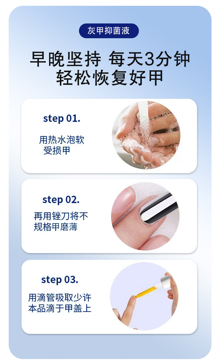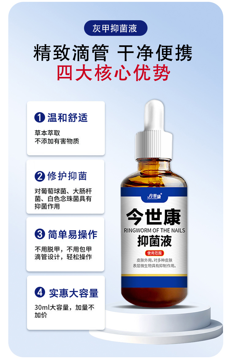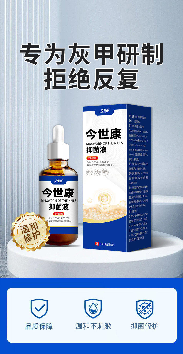 灰趾甲抑菌液,是今世康廠家專為灰趾甲研制,用于腳指甲灰趾甲、指甲萎縮、凹凸不平等指甲問題,給指甲多重呵護,遠離灰甲,抑菌液生產廠家,支持不同材質、規格、形狀、包裝設計,滿足多種渠道需求的抑菌液體加工一站式oem貼牌定制服務。