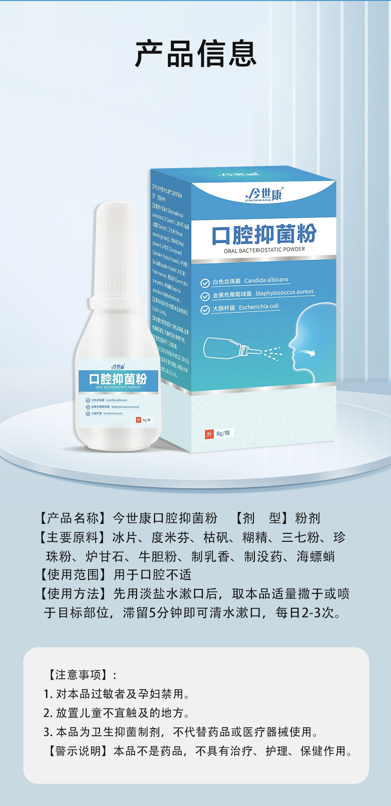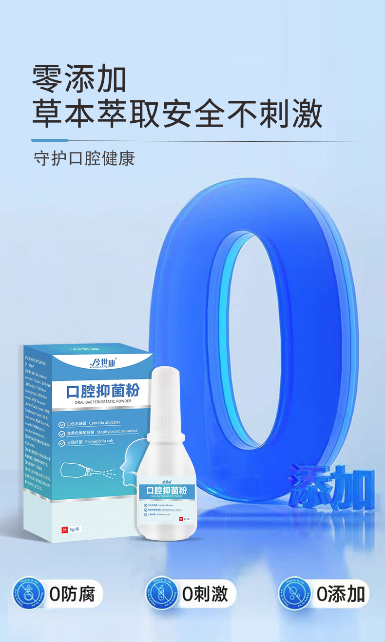 口腔抑菌粉,是今世康廠家專為口腔健康研制,草本萃取,安全不刺激,使用方法先用淡鹽水漱口后,取本品適量撒于或噴于目標部位,滯留5分鐘即可清水漱口,每日2-3次,抑菌粉生產(chǎn)廠家,支持不同材質(zhì)、規(guī)格、形狀、包裝設計,滿足多種渠道需求的粉劑、貼劑、膏劑、液體等一站式oem貼牌加工定制服務。