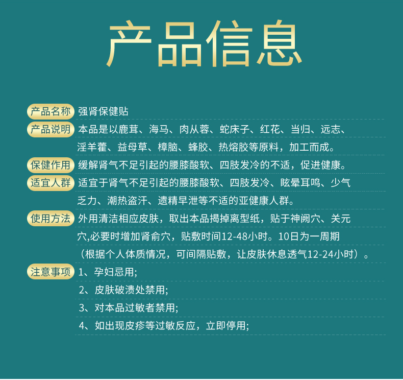 洛陽今世康外用貼劑生產廠家為您提供了馬寺驗方強腎貼,這里是關于強腎貼選自多味植物草本溫和益腎配方熬制,貼敷清爽獨立包裝,緩解腎氣不足引起的腰膝酸軟、四肢發冷的不適,穴位貼敷使用方法,欲了解更多外用貼劑廠家批發代理、oem貼牌代加工信息,歡迎頁面底部電話或留言咨詢!